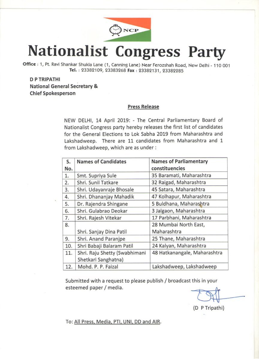महाराष्ट्र में लोकसभा की 48 सीटें है। इनमें से एनसीपी ने 12 सीटों पर उम्मीदवार प्रत्याशी घोषित कर दिए। एनसीपी ने महाराष्ट्र की रायगढ़ लोकसभा सीट से सुनील तटकरे, कोल्हापुर से धनंजय मादिक, बुलढाणा से राजेंद्र शिंगने, जलगांव से गुलाबराव देवकर, परभणी से राजेश मितेकर, मुंबई नॉर्थ ईस्ट से संजय दीनापाटिल, ठाणे से आनंद परांजपे, कल्याण लोकसभा सीट से बाबाजी बलराम पाटिल, लक्षद्वीप से सांसद मोहम्मद फैजल को अपना उम्मीदवार बनाया है।