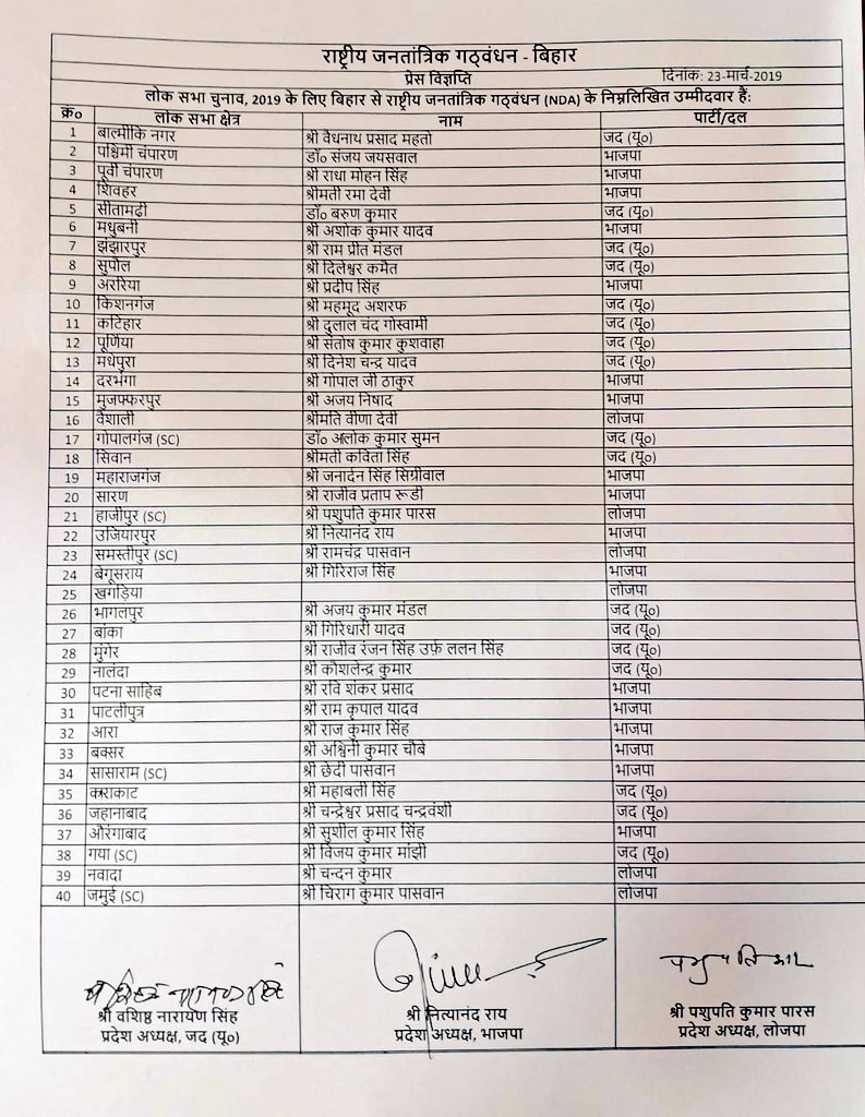 बिहार के भाजपा प्रभारी भूपेंद्र यादव ने संयुक्त प्रेस कॉन्फ्रेंस में उम्मीदवारों के नामों की लिस्ट जारी की। बिहार में एनडीए में शामिल भाजपा और जेडीयू 17-17 सीटों पर चुनाव लड़ रहे हैं जबकि एलजेपी छह सीटों पर चुनाव लड़ रही है। एलजेपी के खाते की खगड़िया पर अभी उम्मीदवार की घोषणा नहीं की गई है। लिस्ट में कई अन्य बड़े नाम हैं। राजीव प्रताप रूडी को सारण से, उजियारपुर से नित्यानंद राय, मुंगेर से लल्लन सिंह, पश्चिम चंपारण से भाजपा के संजय जायसवाल को टिकट दिया गया है।