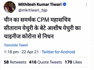 सीपीएम नेता सीताराम येचुरी के बड़े बेटे आशीष येचुरी का आज सुबह कोरोना वायरस के कारण निधन हो गया। आशीष कोरोना वायरस से संक्रमित थे, गुरुग्राम के एक अस्पताल में उनका इलाज चल रहा था। लेकिन इस पर भी ओछी राजनीति रूकने का नाम नहीं ले रही है। नफरतों का बाजार इतना भरा पड़ा है कि भाजपा के एक नेता ने आपत्तिजनक बयान ट्वीट किए। बिहार भारतीय जनता पार्टी (भाजपा) के उपाध्यक्ष मिथिलेश कुमार तिवारी ने आशीष येचुरी की मृत्यु की सूचना के बाद लिखा, "चीन का समर्थक सीपीएम महासचिव सीताराम येचुरी के बेटे आशीष येचुरी का चाइनीज कोरोना से निधन।" तिवारी के इस ट्वीट के बाद लोगों ने सोशल मीडिया पर उन्हें जमकर घेरा। ट्वीटर पर एक यूजर ने लिखा, इतनी बेशरमी विरासत में मिली है, या कोई वैक्सीन लगवाई है इसके लिए। इसके कुछ देर बार ही तिवारी को ट्वीट डिलिट करना पड़ा।