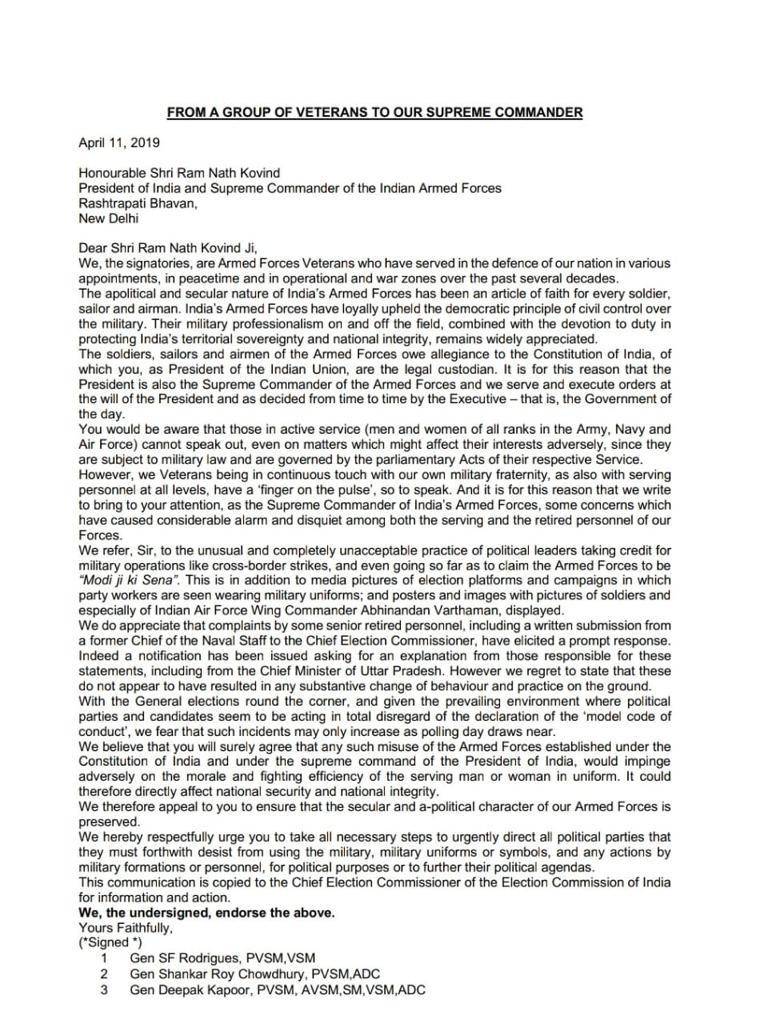 राष्ट्रपति को पत्र लिखने वालों में पूर्व जनरल एसएफ रोड्रिग्स, पूर्व जनरल शंकर राय चौधरी, पूर्व जनरल दीपक कपूर और पूर्व वायुसेना प्रमुख एनसी सूरी शामिल हैं। राष्ट्रपति को लिखे पत्र में पूर्व सैन्य अफसरों ने शिकायत की है कि सेना देश की है किसी पार्टी की नहीं। पत्र में नेताओं की ओर से सैन्य पराक्रम का श्रेय लेने का विरोध जताया गया है। राष्ट्रपति और चुनाव आयोग को चिट्ठी लिखने वालों में 8 पूर्व चीफ ऑफ स्टाफ के नाम शामिल हैं।