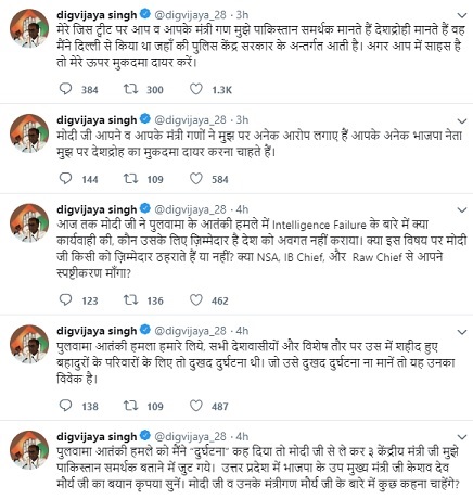 एक दूसरे ट्वीट में दिग्विजय सिंह ने कहा, ''मोदी जी आपने व आपके मंत्री गणों ने मुझ पर अनेक आरोप लगाए हैं आपके अनेक बीजेपी नेता मुझ पर देशद्रोह का मुकदमा दायर करना चाहते हैं।''