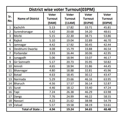 गुजरात के सौराष्ट्र-कच्छ क्षेत्र के 19 जिलों और राज्य के दक्षिणी हिस्सों की कुल 182 सीटों में से 89 पर गुजरात विधानसभा चुनाव के पहले चरण के लिए गुरुवार सुबह 8 बजे मतदान जारी है, जिसमें 788 उम्मीदवारों के भाग्य का फैसला होगा। पहले चरण में सुबह 11 बजे तक 19.13% मतदान हुआ। वहीं दोपहर 3 बजे तक 48.48% वोटिंग दर्ज की गई है।