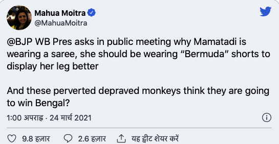 একজন মহিলা মুখ্যমন্ত্রীর সম্বন্ধে এইরকম নিন্দনীয় ভাষা প্রয়োগ প্রমাণ করে যে @BJP4Bengal নেতারা মহিলাদের সম্মান করে না।