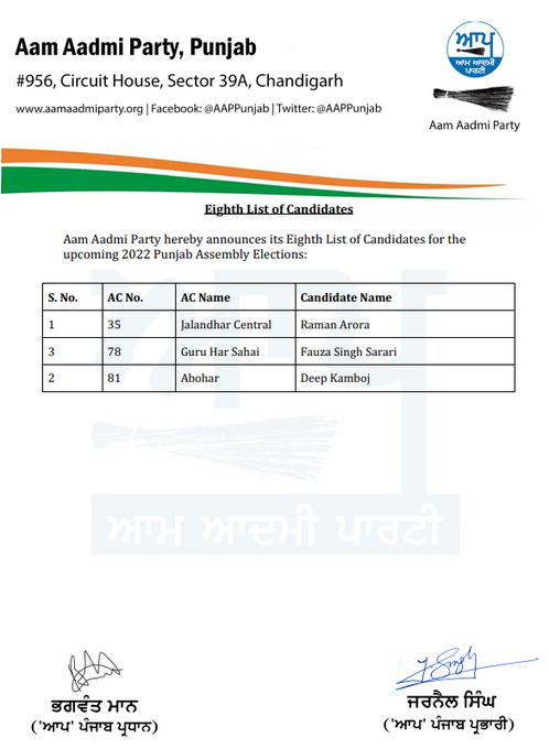आठवी सूची में रमन अरोरा, फौजा सिंह सरारी, दीप कम्बोज के नाम शामिल हैं।