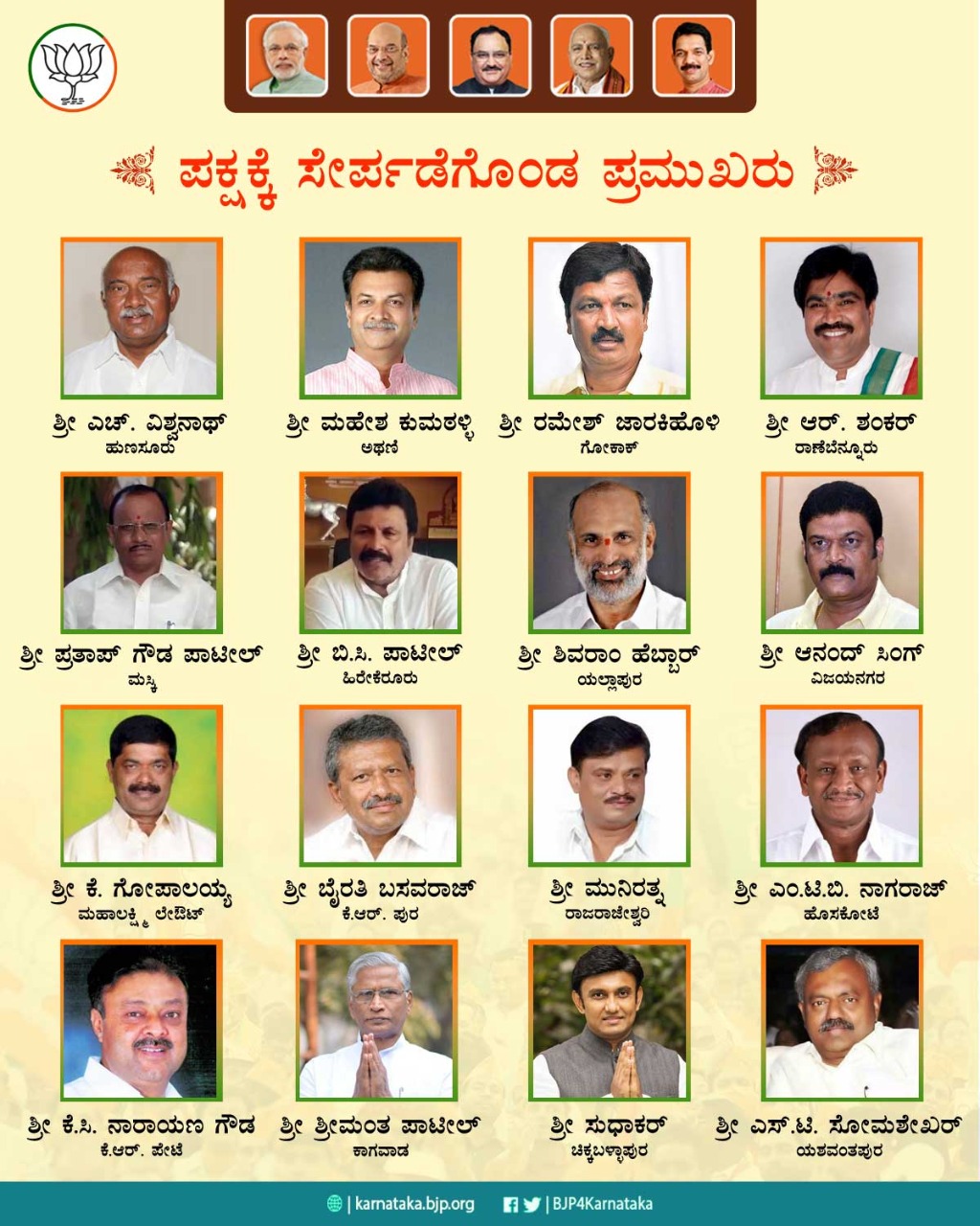 प्रताप गौड़ा पाटिल (मास्की), बी सी पाटिल (हिरेकर), शिवराम हेब्बार (येलापुर), एस टी सोमाशेकर (यशवंतपुर), बयारटी बसवराज (के.आर. पुरम), आनंद सिंह (विजयनगर), एन मुनिरत्न (आर. आर. नगर), के सुधाकर (चिक्काबल्लपुरा), एमटीबी नागराज (होसकोटे), श्रीमंत पाटिल (कागवाड), रमेश जारखोली (गोकक), महेश कुमतल्ली (अथानी) और आर शंकर (रानीबेनूर)। के गोपालैया (महालक्ष्मी लेआउट), एएच विश्वनाथ (हुनसुर) और केसी नारायण गौड़ा (के.आर. पेट)।