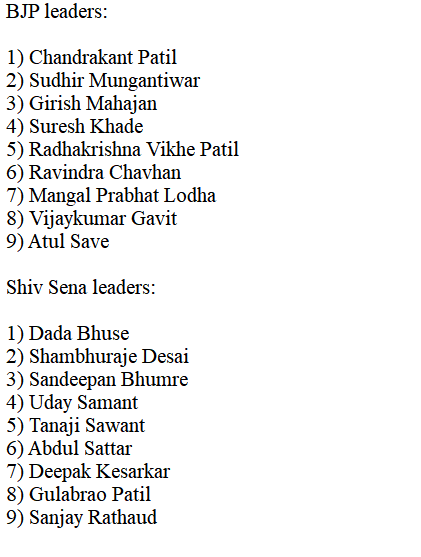 मंत्रिमंडल में बीजेपी की तरफ से चंद्रकांत पाटिल, सुधीर मुंगतिवार, गिरीश महाजन, सुरेश खड़े, राधा कृष्ण विखे पाटिल, रविंद्र चव्हाण, मंगल प्रभात लोधा, विजय कुमार गवित, अतुल सवे शामिल हुए।