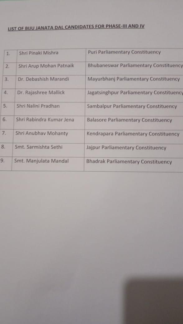 ओडिशा में बीजू जनता दल (बीजद) ने लोकसभा चुनाव 2019 के लिए बुधवार को उम्मीदवारों की एक और लिस्ट जारी की है। इस लिस्ट मे 9 उम्मीदवार उतारे गए हैं। ओडिशा की पुरी लोकसभा सीट से पिनाकी मिश्रा को टिकट दिया है। वो भाजपा के संबित पात्रा के खिलाफ चुनाव लड़ेंगे। भुवनेश्वर से अनूप पटनायक को टिकट मिला है। इसके साथ ही बीजद ने ओडिशा में विधानसभा चुनाव के लिए 36 उम्मीदवारों की लिस्ट जारी की है।