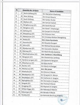 इसके अलावा भारतीय जनता पार्टी ने मेघालय विधानसभा चुनाव के लिए भी सभी 60 सीटों पर प्रत्याशियों की घोषणा कर दी है। नलिन कोहली ने कहा है कि मेघालय चुनाव के लिए हमारी टैगलाइन है 'एम पॉवर मेघालय' यानी 'मोदी पॉवर्ड मेघालय', उन्होंने कहा, जल्द ही यहां भी डबल इंजन की सरकार बनेगी।