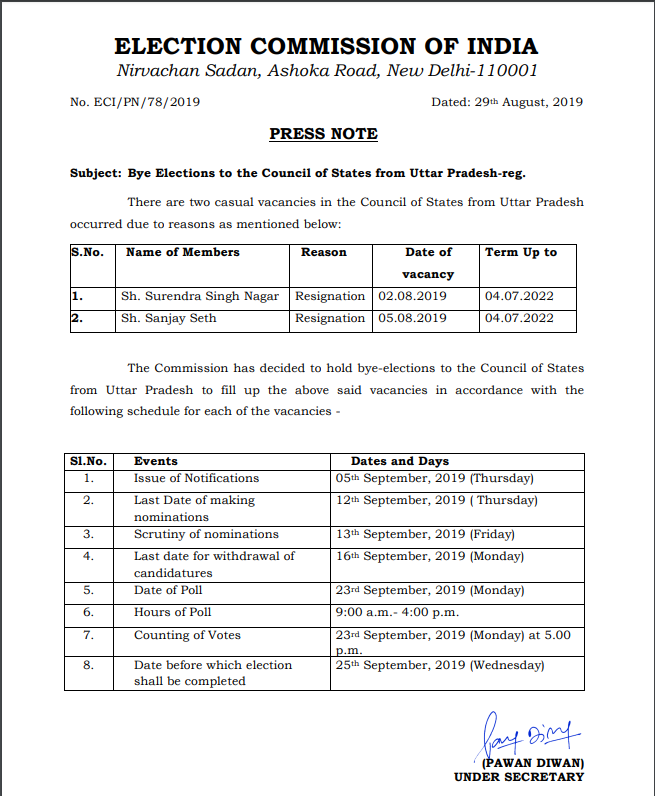 नामांकन की आखिरी तारीख 12 सितंबर है। वहीं, नाम वापस लेने की आखिरी तारीख 16 सितंबर है। बता दें कि सपा के राज्यसभा सदस्य पूर्व प्रधानमंत्री चंद्रशेखर के बेटे नीरजा शेखर, सुरेंद्र सिंह नागर ने इस्तीफा दिया था। इसके साथ ही सपा नेता रहे संजय सेठ ने भी पार्टी से इस्तीफा दिया था। पार्टी से इस्तीफे के बाद तीनों नेता बीजेपी में शामिल हुए थे।