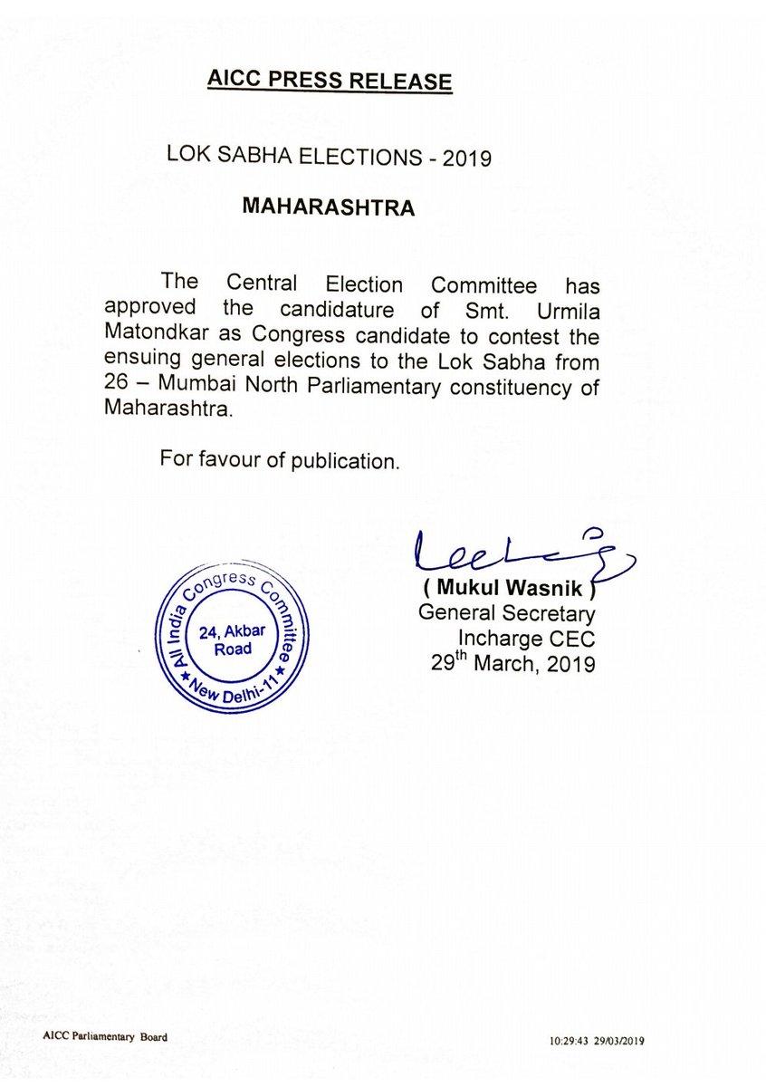 लोकसभा चुनाव से पहले नेताओं और अभिनेताओं का राजनीतिक दलों में शामिल होने का सिलसिला जारी है। दो दिन पहले कांग्रेस पार्टी की सदस्यता ग्रहण करने के बाद अब बॉलीवुड एक्ट्रेस उर्मिला मातोंडकर को कांग्रेस ने नार्थ मुंबई सीट से प्रत्याशी बनाया है। 27 फरवरी को ही कांग्रेस अध्यक्ष राहुल गांधी से मुलाकात के बाद उर्मिला ने पार्टी की सदस्यता ली थी।इससे एक दिन पहले जया प्रदा ने बीजेपी और दक्षिण सिनेमा के मशहूर अभिनेता मोहन बाबू ने वाईएसआर कांग्रेस जॉइन किया था।