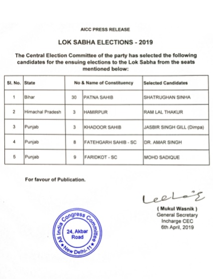 आगामी लोकसभा चुनाव को लेकर पंजाब में 6 उम्मीदवार ऐलान कर चुकी कांग्रेस ने तीन अन्य उम्मीदवारों के नाम पर मुहर लगा दी है। फतेहगढ़ साहिब से डॉ. अमर सिंह, खडूर साहिब से जसबीर सिंह डिम्पा और फरीदकोट से मोहम्मद सदीक को उम्मीदवार घोषित किया गया है। यह फैसला शुक्रवार को पंजाब प्रदेश कांग्रेस की स्क्रीनिंग कमेटी के सदस्यों की राहुल गांधी के साथ दिल्ली में हुई मीटिंग में लिया गया। इस मीटिंग में मुख्यमंत्री कैप्टन अमरिंदर सिंह, पंजाब मामलों की इंचार्ज आशा कुमारी और पंजाब कांग्रेस के प्रधान सुनील जाखड़ मौजूद थे। सूत्रों के मुताबिक, इन तीन के अलावा अभी भी 4 उम्मीदवारों के नाम पर पेच फंसा हुआ है, जिस पर आखिरी फैसला पार्टी अध्यक्ष राहुल गांधी की तरफ से ही लिया जाना है।