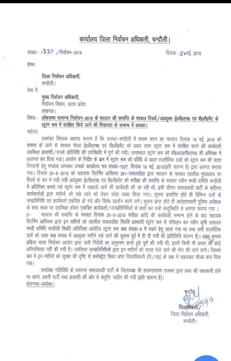 कई स्थानों पर ईवीएम की हेराफेरी के आरोपों पर चंदौली के मुख्य निर्वाचन अधिकारी ने कहा कि 19 मई को सातवें और आखिरी चरण का मतदान खत्म होने के बाद ईवीएम और वीवीपैट को डबल लॉक स्ट्रांग रूम में संरक्षित करने की कार्यवाही वहां मौजूद प्रत्याशी की उपस्थिति में की गई। इसके बाद स्ट्रांग रूम को सीआरपीएफ की सुरक्षा में सौंप दिया गया। इसके बाद 20 मई को रिटर्निंग ऑफिसर द्वारा दूसरी जगह बनाए गए स्ट्रांग रूम में रखवाए जाने की कार्यवाही की ही जा रही थी कि इसी दौरान समाजवादी पार्टी के कार्यकर्ताओं द्वारा मशीनों को लेकर संदेह व्यक्त किया गया। यह बात फैलने के बाद विभिन्न दलों के जनप्रतिनिधि एवं कार्यकर्ता इकट्ठे हो गए और विरोध प्रदर्शन करने लगे। इसके बाद मामले की जानकारी मिलते ही मौके पर पहुंचे पुलिस अधीक्षक ने वहां मौजूद कार्यकर्ताओं से बात कर उन्हें वस्तुस्थिति से अवगत कराया और कहा कि ईवीएम और वीवीपैट को दूसरे स्ट्रांग रूम में रखे जाने का काम आयोग द्वारा जारी निर्देशों का अनुसरण करते हुए पूरा किया गया था। इसमें किसी भी प्रकार की कोई अनियमितता नहीं की गई है।