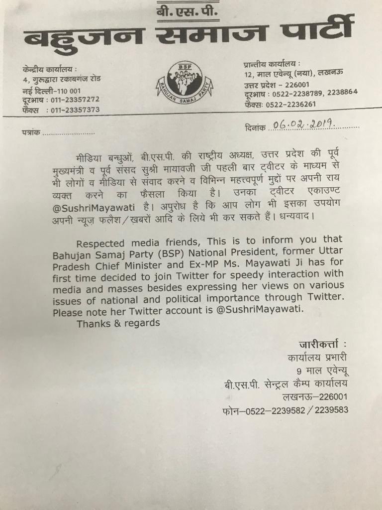 बहुजन समाज पार्टी की तरफ से बाकायदा इस संबंध में प्रेस नोट जारी किया गया है। बुधवार (6 जनवरी) को जारी इस प्रेस नोट में घोषणा की गई है कि बीएसपी की राष्ट्रीय अध्यक्ष सुश्री मायावती ने पहली बार ट्विटर के माध्यम से भी लोगों व मोडिया से संवाद करने का फैसला किया है। उनका ट्विटर अकाउंट @SushriMayawati है।