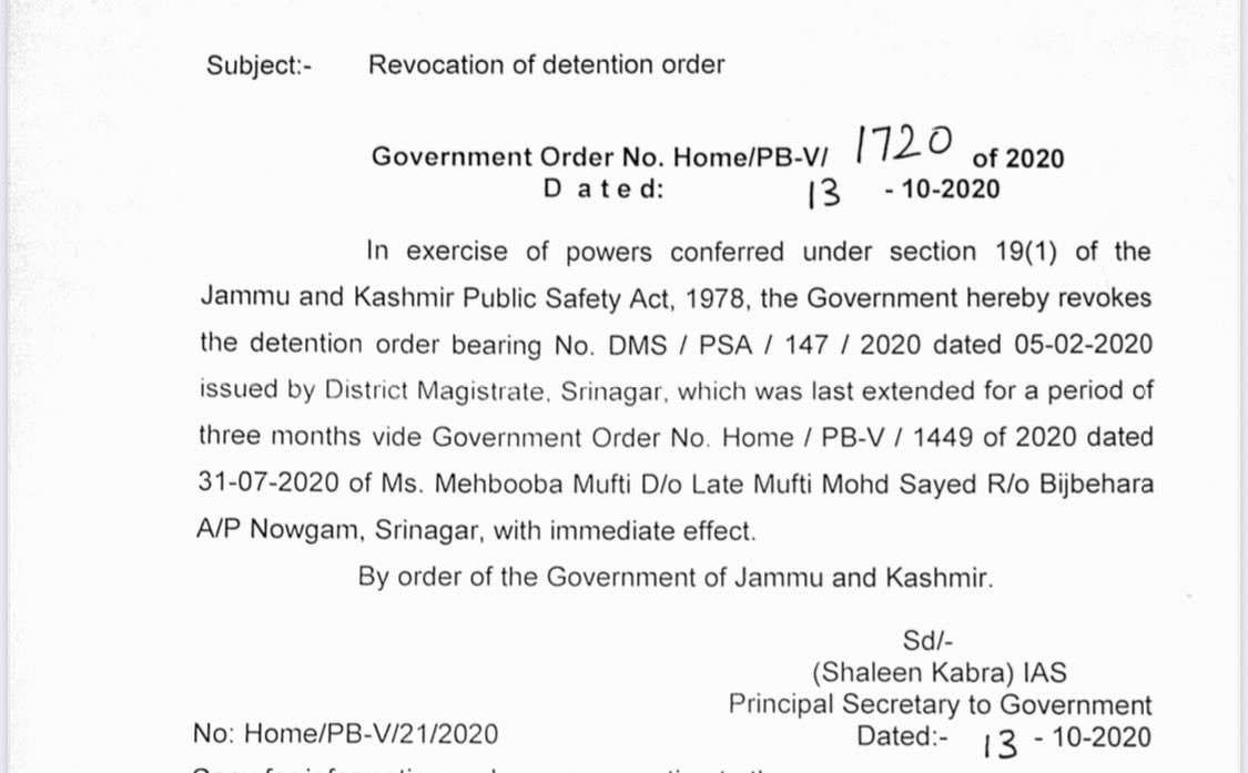 जम्मू-कश्मीर प्रशासन के प्रवक्ता रोहित कंसल ने कहा कि PDP प्रमुख महबूबा मुफ़्ती को नज़रबंदी से रिहा किया जा रहा है।