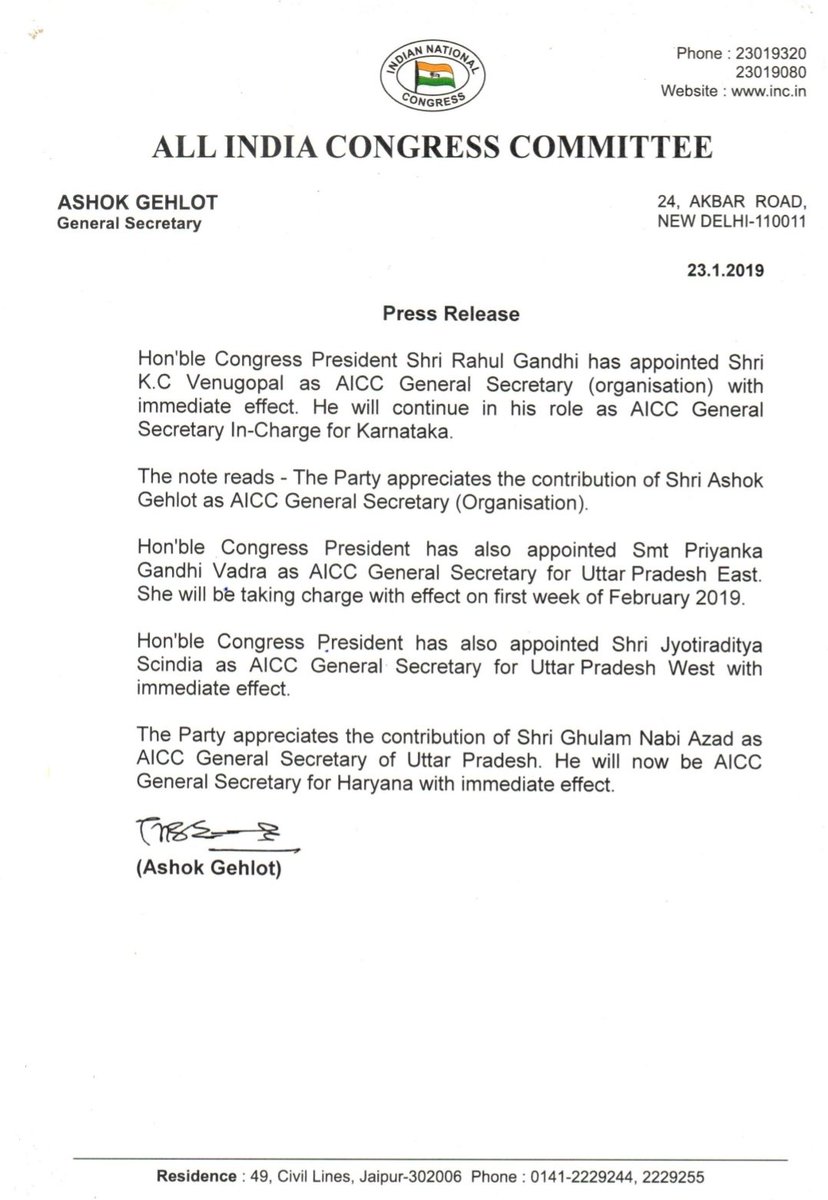 मध्यप्रदेश विधानसभा चुनाव में कांग्रेस की जीत में अहम भूमिका निभाने वाले ज्योतिरादित्य सिंधिया को भी कांग्रेस महासचिव बनाया गया है। उन्हें पश्चिमी उत्तर प्रदेश की जिम्मेदारी दी गई है। वहीं, अब तक पार्टी के मुख्य महासचिव रहे अशोक गहलोत की जिम्मेदारी केसी वेणुगोपाल को दी गई है। वेणुगोपाल कर्नाटक के प्रभारी भी होंगे। सपा-बसपा गठबंधन से अलग होने के बाद कांग्रेस लोकसभा चुनाव में इस बार राज्य में अकेले उतर रही है।