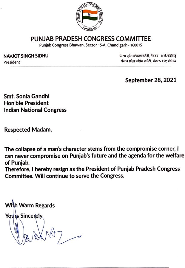 नवजोत सिंह सिद्धू ने कांग्रेस की कार्यकारी अध्यक्ष सोनिया गांधी को लिखे पत्र में कहा, "मनुष्य का चारित्रिक पतन समझौतों से ही शुरू होता है और मैं पंजाब के भविष्य और पंजाब के कल्याण के एजेंडे के साथ समझौता नहीं कर सकता हूं... इसलिए, मैं पंजाब प्रदेश कांग्रेस के अध्यक्ष पद से इस्तीफा देता हूं... कांग्रेस की सेवा करता रहूंगा..."।