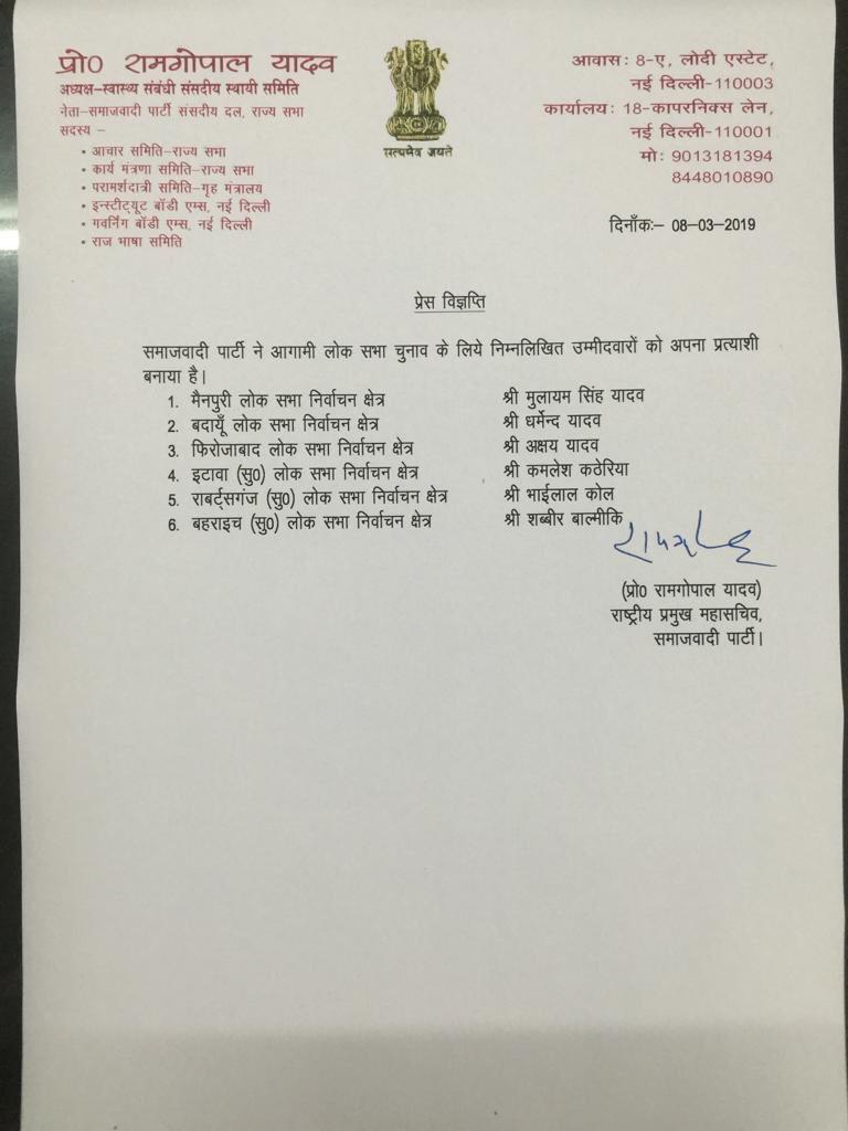 समाजवादी पार्टी ने बदायूं सीट से धर्मेन्द्र यादव, फिरोजाबाद से पार्टी महासचिव राम गोपाल यादव के पुत्र अक्षय यादव, बहराइच से शब्बीर बाल्मीकि, रॉबर्ट्सगंज से भाईलाल कोल और इटावा सीट से कमलेश कठेरिया को उम्मीदवार बनाया है। 2014 के लोकसभा चुनाव के दौरान एसपी को यूपी की 80 में से 5 सीटों पर जीत हासिल हुई थी। इनमें मुलायम के अलावा उनके भतीजे धर्मेन्द्र यादव, अक्षय यादव और बहू डिंपल यादव शामिल थीं। डिंपल ने कन्नौज सीट से चुनाव लड़ा था।