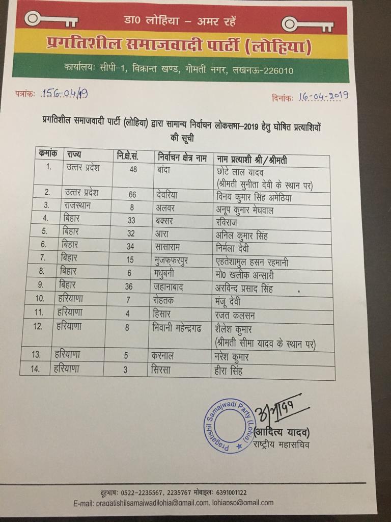 लोकसभा चुनाव के लिए शिवपाल यादव की प्रगतिशील समाजवादी पार्टी (लोहिया) ने 14 उम्मीदवारों की नई लिस्ट जारी की है। इसमें यूपी की दो, राजस्थान की एक, बिहार की 6 और हरियाणा की 5 सीटों के लिए उम्मीदवारों के नामों का ऐलान किया है।