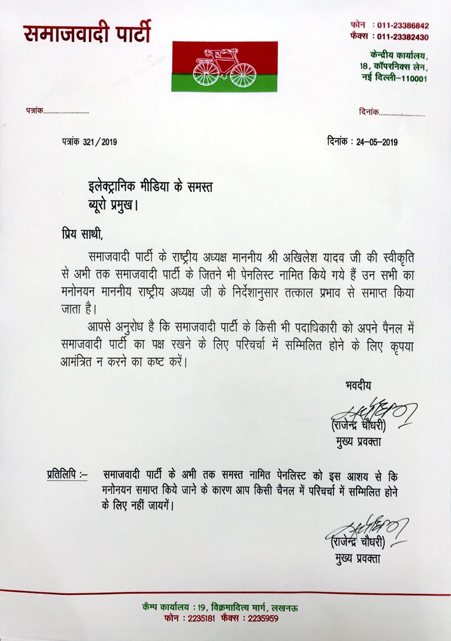 सपा के प्रवक्ता राजेंद्र ने एक पत्र जारी कर कहा है कि, पार्टी अध्यक्ष अखिलेश यादव की स्वीकृति से अभी तक पार्टी के जिनते भी पैनलिस्ट नामित किए गए हैं, उन सभी का मनोनयन तत्काल प्रभाव से समाप्त किया जाता है। उन्होंने इलेक्ट्रानिक मीडिया से अनुरोध किया है कि, चर्चा-परिचर्चा में सपा का पक्ष रखने के लिए आमंत्रित न किया जाए। इस पत्र की कॉपी पैनलिस्टों को भी भेजी गई है। इसमें साफ हिदायत दी गई है कि, मनोनयन समाप्त किए जाने के कारण किसी चैनल की परिचर्चा में शामिल होने न जाएं।