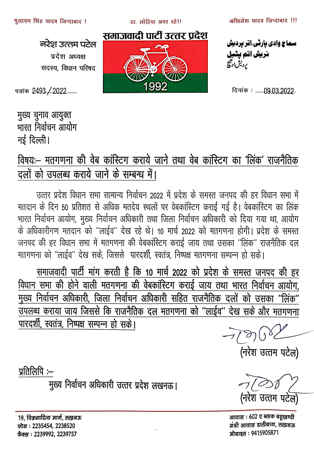 सपा ने मुख्य चुनाव आयुक्त को भेजी चिट्ठी में लिखा है "उत्तर प्रदेश विधान सामान्य निर्वाचन 2022 प्रदेश समस्त जनपद हर सभा में दिन 50 प्रतिशत अधिक मतदेय पर वेबकांस्टिग आयोग, मुख्य निर्वाचन अधिकारी तथा निर्वाचन अधिकारी को दिया गया था। आयोग के अधिकारीगण मतदान को "लाईव" देख रहे थे।