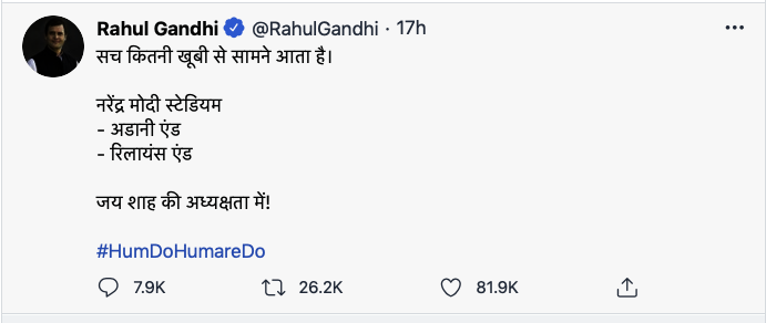 इस स्टेडियम में एंड (छोर) के नाम देश के दो बड़े उद्योगपति रिलायंस और अडानी के नाम पर रखे गए हैं। कांग्रेस नेता राहुल गांधी ने हैशटैग “हम दो हमारे दो” #HumDoHumareDo के साथ ट्वीट करके तंज कसा है। वहीं, इसे लेकर सोशल मीडिया में बहुत सारे मीम शेयर होने लगें। कांग्रेस नेता राहुल गांधी ने ट्वीट करते हुए लिखा, "सच कितनी खूबी से सामने आता है। नरेंद्र मोदी स्टेडियम - अडानी एंड - रिलायंस एंड जय शाह की अध्यक्षता में!"