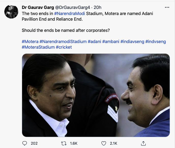 सोशल मीडिया यूजर्स ने भी केंद्र की मोदी सरकार और अंबानी-अडानी को लेकर ट्रोल किया। एक यूजर ने लिखा, "नरेंद्र मोदी स्टेडियम में दो छोर, मोटेरा का नाम अडानी पविलियन एंड और रिलायंस एंड है। क्या कॉरपोरेट्स के नाम पर अंत होना चाहिए?"