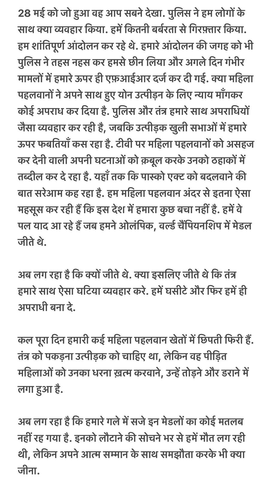 “28 मई को जो हुआ वह आप सब ने देखा। पुलिस ने हम लोगों के साथ क्या किया, हमें कितनी बर्बरता से गिरफ्तार किया। हम शांतिपूर्ण आंदोलन कर रहे थे। हमारे आंदोलन की जगह को भी पुलिस ने तहस-नहस कर हमसे छीन लिया और अगले दिन गंभीर मामलों में हमारे ऊपर ही एफआईआर दर्ज कर दी गई। क्या महिला पहलवानों ने अपने साथ हुए यौन उत्पीड़न के लिए न्याय मांग कर कोई अपराध कर दिया? पुलिस और तंत्र हमारे साथ अपराधियों जैसा व्यवहार कर रही है, जबकि उत्पीड़क खुली सभाओं में हमारे ऊपर फब्तियां कस रहा है। टीवी पर महिला पहलवानों को असहज कर देने वाली घटनाओं को कबूल करके उनको ठहाकों में तब्दील कर दे रहा है, यहां तक कि पोक्सो एक्ट को बदलवाने की बात सरेआम कह रहा है। हम महिला पहलवान अंदर से ऐसा महसूस कर रही हैं कि इस देश में हमारे लिए कुछ नहीं बचा है। हमें वे पल याद हैं जब हमने ओलंपिक, वर्ल्ड चैंपियन में मेडल जीते थे।