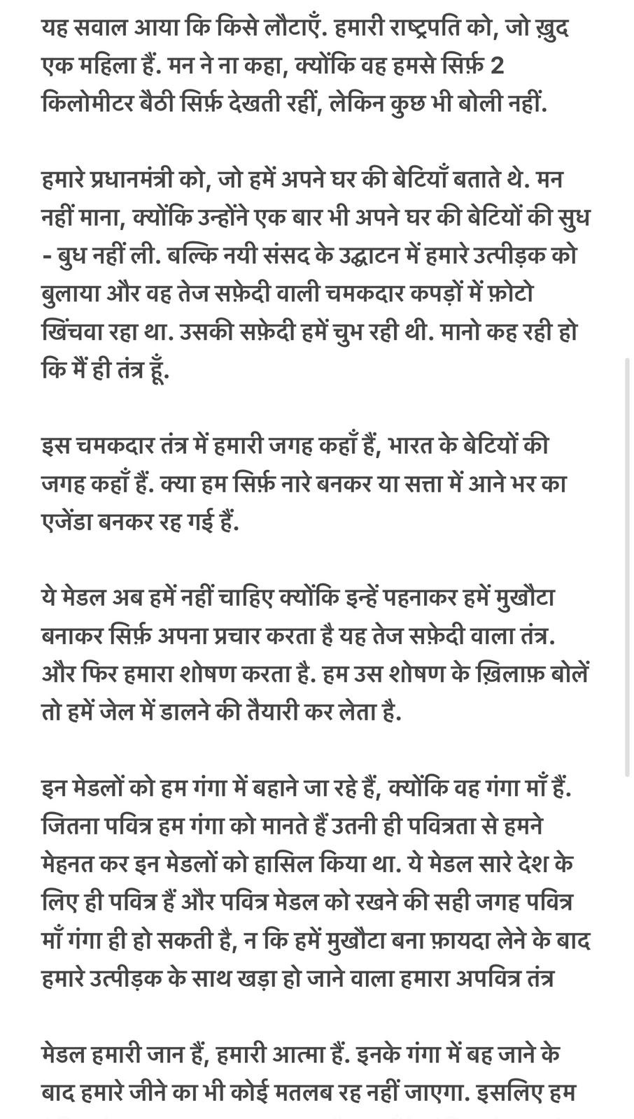 इन मेडलों को हम गंगा में बहाने जा रहे हैं, क्योंकि जितना पवित्र हम गंगा मां को मानते हैं, उतनी ही पवित्रता से हमने मेहनत कर इन मेडलों को हासिल किया था। यह मेडल सारे देश के लिए ही पवित्र हैं और पवित्र मेडलों को रखने की सही जगह मां गंगा ही हो सकती हैं, ना कि हमें मुखौटा बनाकर फायदा लेने के बाद हमारे उत्पीड़क के साथ खड़ा हो जाने वाला हमारा अपवित्र तंत्र