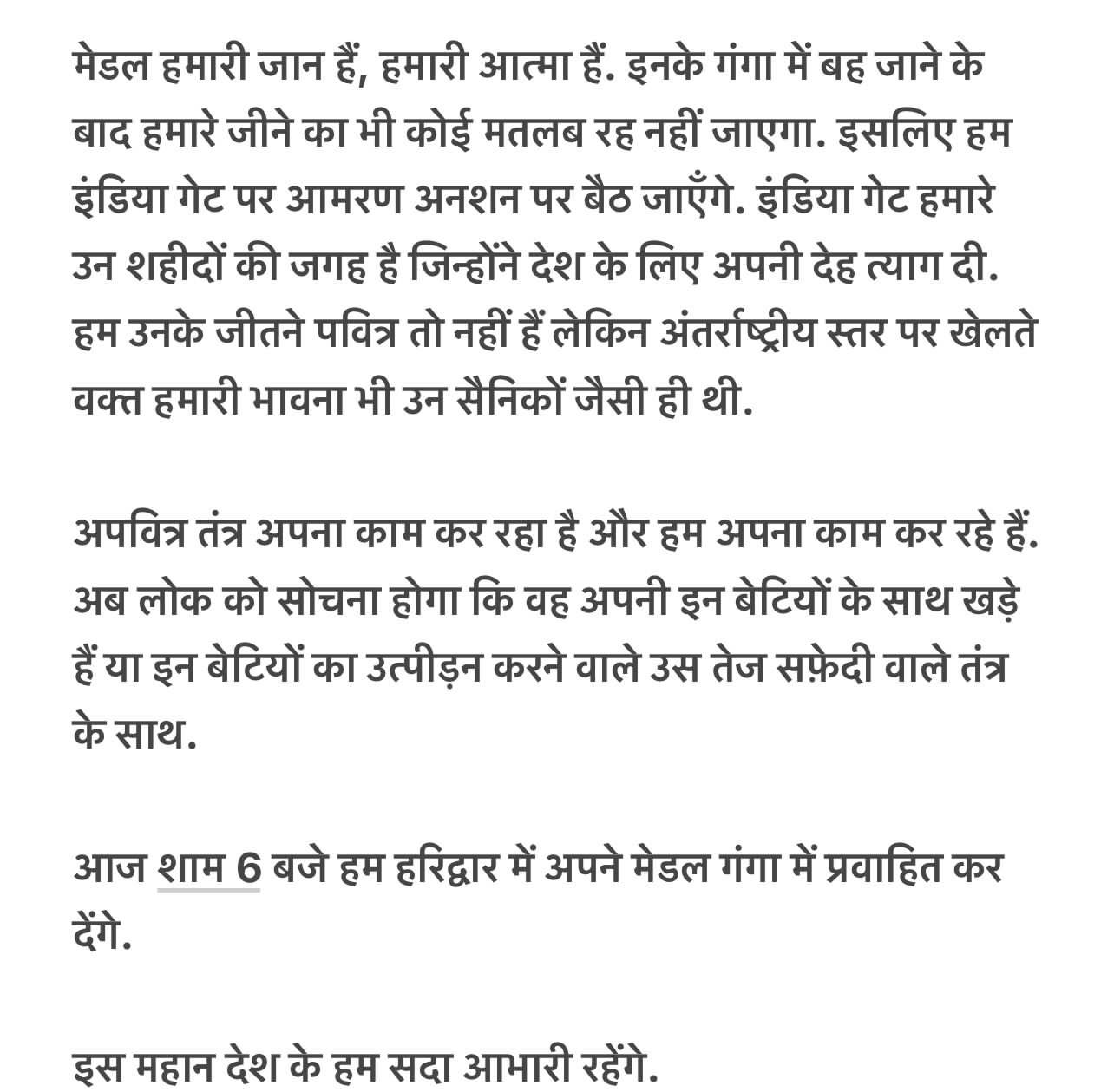मेडल हमारी जान हैं, हमारी आत्मा है। इनके गंगा में बह जाने के बाद हमारे जीने का कोई मतलब नहीं रह जाएगा। इसलिए हम इंडिया गेट पर आमरण अनशन पर बैठ जाएंगे। इंडिया गेट हमारे उन शहीदों की जगह है, जिन्होंने देश के लिए अपनी देह त्याग दी। हम उनके जितने पवित्र तो नहीं हैं, लेकिन अंतरराष्ट्रीय स्तर पर खेलते वक्त हमारी भावना भी उन सैनिकों जैसी ही थीं।
