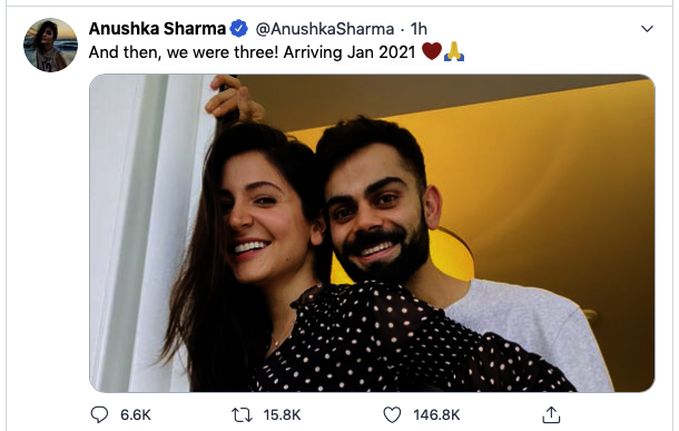 भारतीय क्रिकेट टीम के कप्तान विराट कोहली और अनुष्का शर्मा ने सोशल मीडिया पर अपनी तस्वीर साझा कर एक बड़ी खुशखबरी दी है। अनुष्का शर्मा ने विराट संग एक तस्वीर पोस्ट कर लिखा, 'तब हम तीन होंगे। आने वाला है जनवरी 2021 में।' यानी विराट के घर नया मेहमान आने वाला है। अनुष्का शर्मा गर्भवती हैं। अनुष्का और विराट की शादी 11 नवंबर 2017 में हुई थी। इससे पहले दोनों ने एक-दूसरे को डेट किया था।