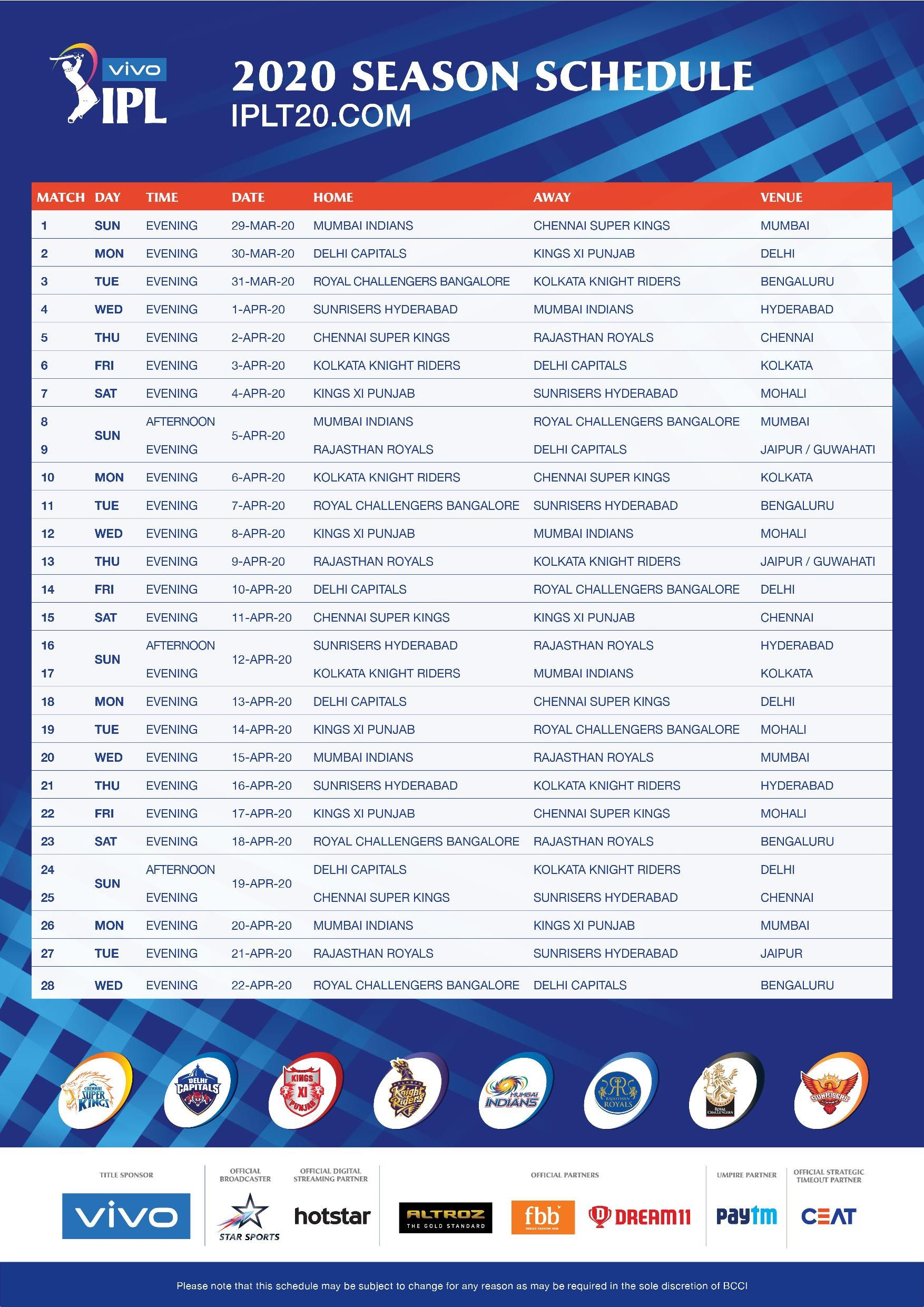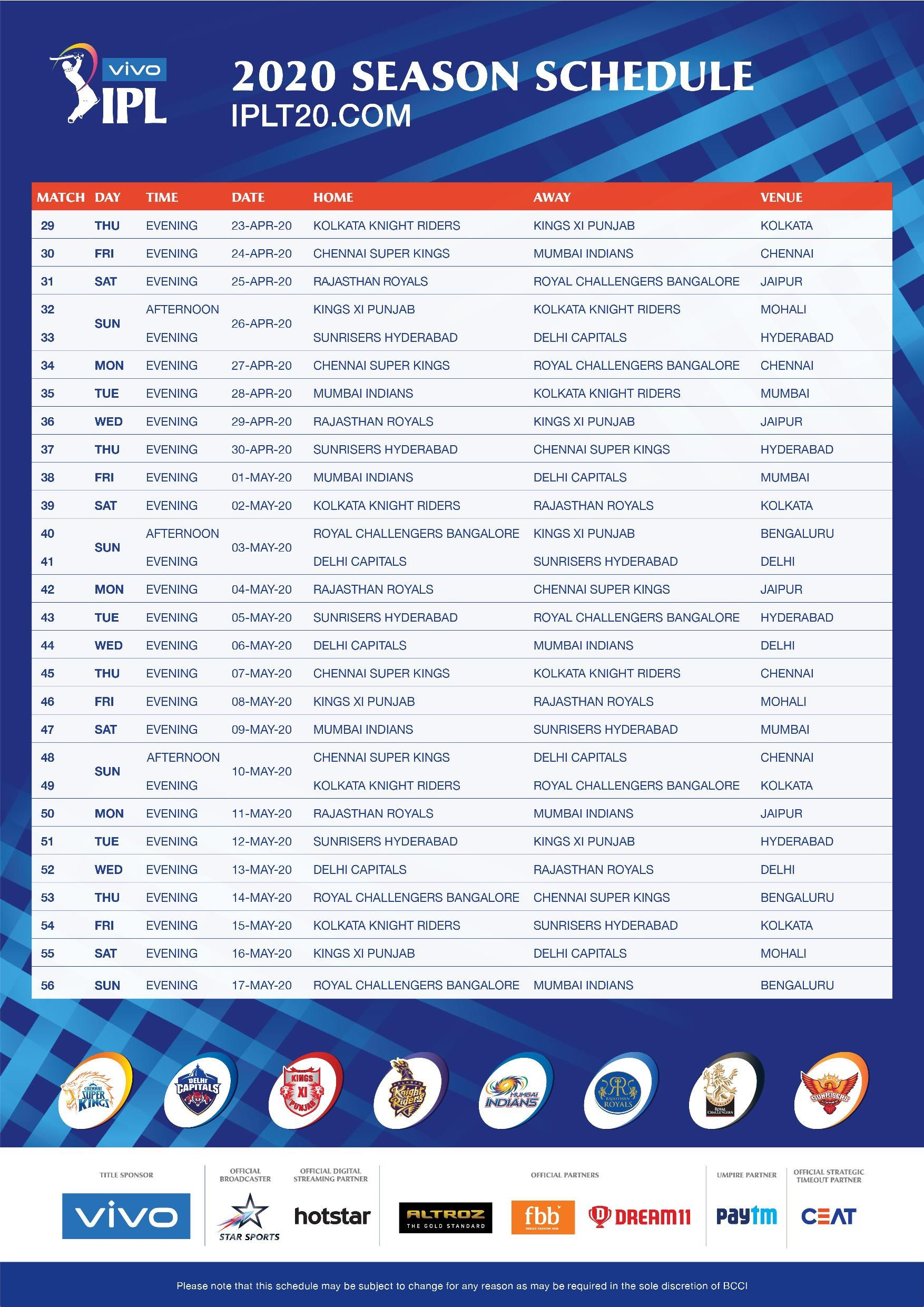 आईपीएल गवर्निंग काउंसिल ने मंगलवार को आईपीएल के 13वें सीजन के लिए कार्यक्रम का ऐलान कर दिया है। बीसीसीआई के सचिव जय शाह द्वारा जारी प्रेस रिलीज में बताया गया कि लीग चरण की शुरुआत 29 मार्च को डिफेंडिंग चैंपियन मुंबई इंडियन्स और चेन्नई सुपर किंग्स के बीच मुकाबले के साथ होगी। लीग दौर 17 मई तक चलेगा। लीग दौर का आखिरी मुकाबला रोयल चैलेंजर्स बैंगलौर और मुंबई इंडियंस के बीच एम चिन्नास्वामी स्टेडियम में खेला जाएगा। फाइनल मुकाबला 24 मई को खेला जाएगा।