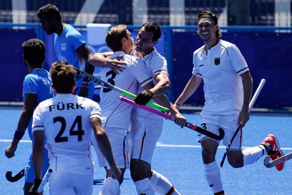टोक्यो ओलंपिक में कांस्य पदक मैच के दौरान भारत पर गोल करने के बाद जर्मनी के मैट जर्गन ग्रैम्बुश अपनी टीम के साथी तैमूर ओरुज़ को गले लगाते। (एपी)