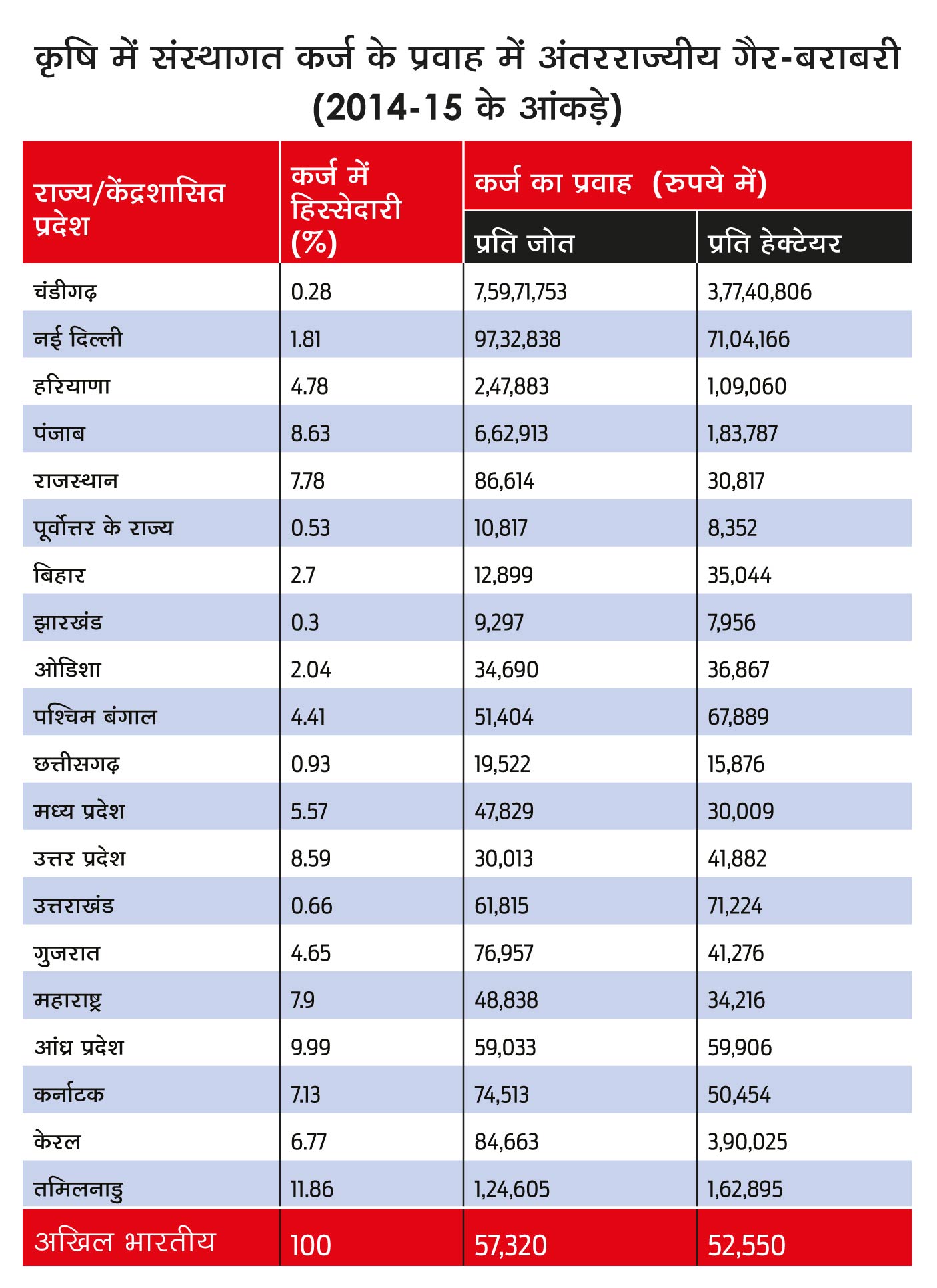 अलग-अलग क्षेत्रों में रकबे और जोत के हिसाब से संस्थागत कर्ज के अनुपात में भी काफी फर्क है। यह उत्तर भारत में सबसे अधिक और पूर्वोत्तर में सबसे कम था। यह तालिका 1 से भी देखा जा सकता है कि 2014-15 में औसतन प्रति जोत कर्ज का प्रवाह पूरे देश में 57,320 रुपये था जबकि पूर्वी क्षेत्रों में सबसे कम 24,485 रुपये था। बिहार और झारखंड में प्रति जोत औसत कर्ज प्रवाह केवल 12,899 रुपये और 9,297 रुपये था। इसी तरह, देश में प्रति हेक्टेयर औसत कर्ज 52,550 रुपये, लेकिन पूर्वी क्षेत्र में यह राष्ट्रीय औसत से काफी कम 40,229 रुपये था। झारखंड में प्रति हेक्टेयर कर्ज की उपलब्धता 7,956 रुपये से भी कम थी। पूर्वोत्तर में संस्थागत कर्ज प्रति हेक्टेयर 8,352 रुपये ही उपलब्ध था। कृषि के लिए प्रति हेक्टेयर संस्थागत कर्ज अंतरराज्यीय स्तर पर भी समय के साथ असंतुलित होता चला गया। यह 1995-96 में 120 प्रतिशत से 2014-15 में बढ़कर 201 प्रतिशत हो गया।