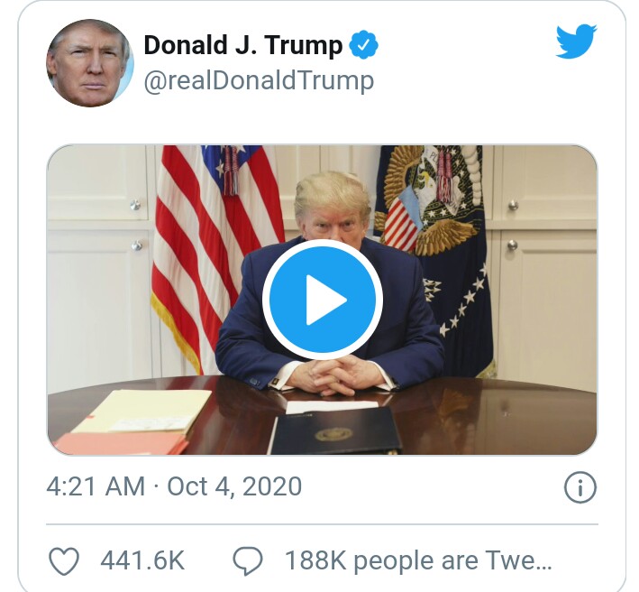 कोविड-19 संक्रमित होने का पता चलने के बाद वाशिंगटन के नजदीक वाल्टर रीड मिलेट्री सेंटर में ट्रंप का इलाज चल रहा है। उन्होंने वीडियो में, "अब मैं काफी अच्छा महसूस कर रहा हूं, मुझे हर प्रकार से ठीक करने के लिए कड़ी मेहनत की जा रही है। मुझे लगता है कि मैं जल्द ही वापस आऊंगा और यह जो अभियान शुरू हुआ था, मैं उस अभियान को समाप्त करने के लिए तत्पर हूं।''