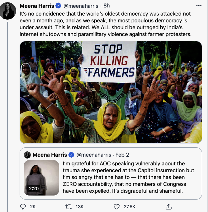 मीना हैरिस ने ट्वीट कर कहा कि 'यह कोई संयोग नहीं है कि दुनिया के सबसे पुराने लोकतंत्र पर एक महीने से हमला किया गया और अब सबसे बड़े लोकतंत्र पर हमला किया जा रहा है। यह संबंधित मामला है। हम सभी को भारत के इंटरनेट शटडाउन और किसान प्रदर्शनकारियों के खिलाफ अर्धसैनिक हिंसा के खिलाफ आवाज उठानी चाहिए।' गौरतलब है कि ट्रंप समर्थकों ने अमेरिकी कैपिटल पर धाबा बोल दिया था। इस प्रदर्शन और पुलिस के साथ हुई झड़प में चार लोगों की मौत हो गई। वहीं, भारत में किसान आंदोलन के दौरान विभिन्न कारणों से 150 से अधिक किसानों की मौत हो चुकी है।