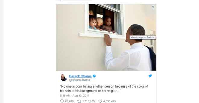 इस मामले में ट्रंप को अपने पूर्ववर्ती बराक ओबामा से मात खानी पड़ी है। ओबामा के तीन ट्वीट रिट्वीट किए गए शीर्ष दस संदेशों में जगह बनाने में सफल रहे हैं। ट्विटर ने बताया है कि ट्रंप उन नेताओं में चुने गए हैं जिनके बारे में सबसे ज्यादा इस साल ट्वीट किए गए। ओबामा के निजी ट्विटर अकाउंट से किए गए ट्वीट को सबसे ज्यादा करीब चार करोड़ 60 लाख ‘‘लाइक्स” मिले थे। यह ट्वीट उस दिन किया गया था जिस दिन वर्जीनिया के शारलोट्सविले में श्वेतों को सर्वश्रेष्ठ मानने वालों की हिंसक रैली हुई थी।