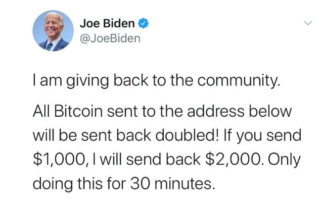 हैकरों ने माइक्रोसॉफ्ट के सह संस्थापक बिल गेट्स के ट्विटर अकाउंट से ट्वीट किया, 'हर कोई मुझसे वापस देने को कह रहा है और अब समय आ गया है। मैं अगले 30 मिनट तक बीटीसी एड्रेस पर भेज गए सभी पेमेंट को दोगुना कर रहा हूं। आप एक हजार डॉलर भेजिए और मैं आपको दो हजार डॉलर वापस भेजूंगा।'