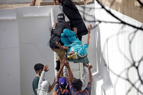 घायल महिला को बचाने में जुटे राहत बचाव दल के सदस्य/ एपी फोटो/ फरीद खान
