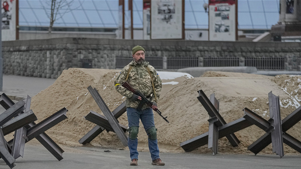 यूक्रेन के कीव में मैदान स्क्वायर में एक हवाई हमले के अलार्म के दौरान बैरिकेड के पास खड़ा एक सशस्त्र व्यक्ति