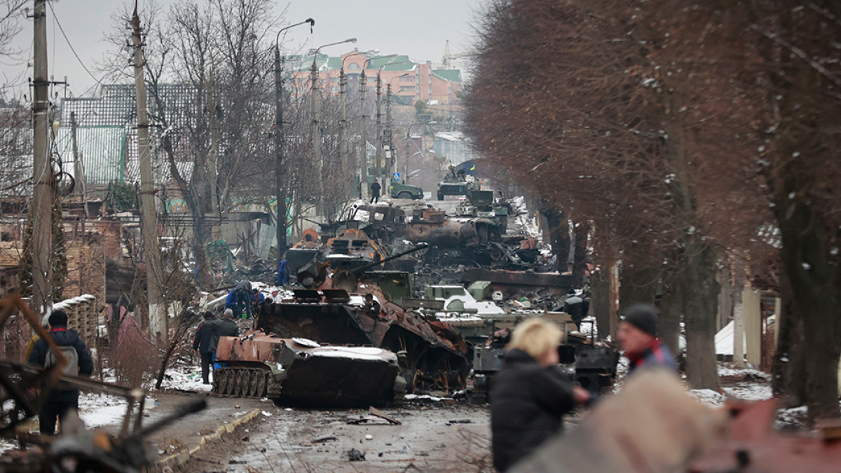 राजधानी कीव, यूक्रेन के करीब बुचा शहर में एक सड़क पर रूसी सैन्य वाहनों के जले हुए अवशेष