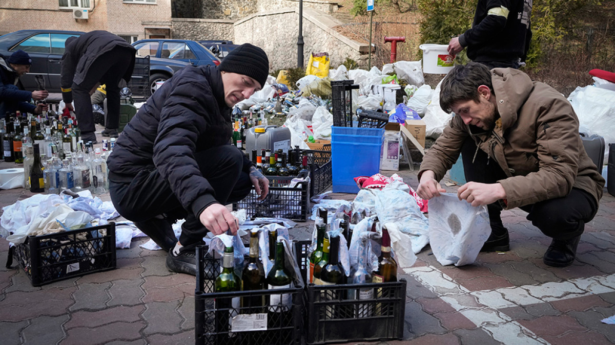 यूक्रेन के कीव में एक यार्ड में मोलोटोव कॉकटेल तैयार करते नागरिक रक्षा के सदस्य