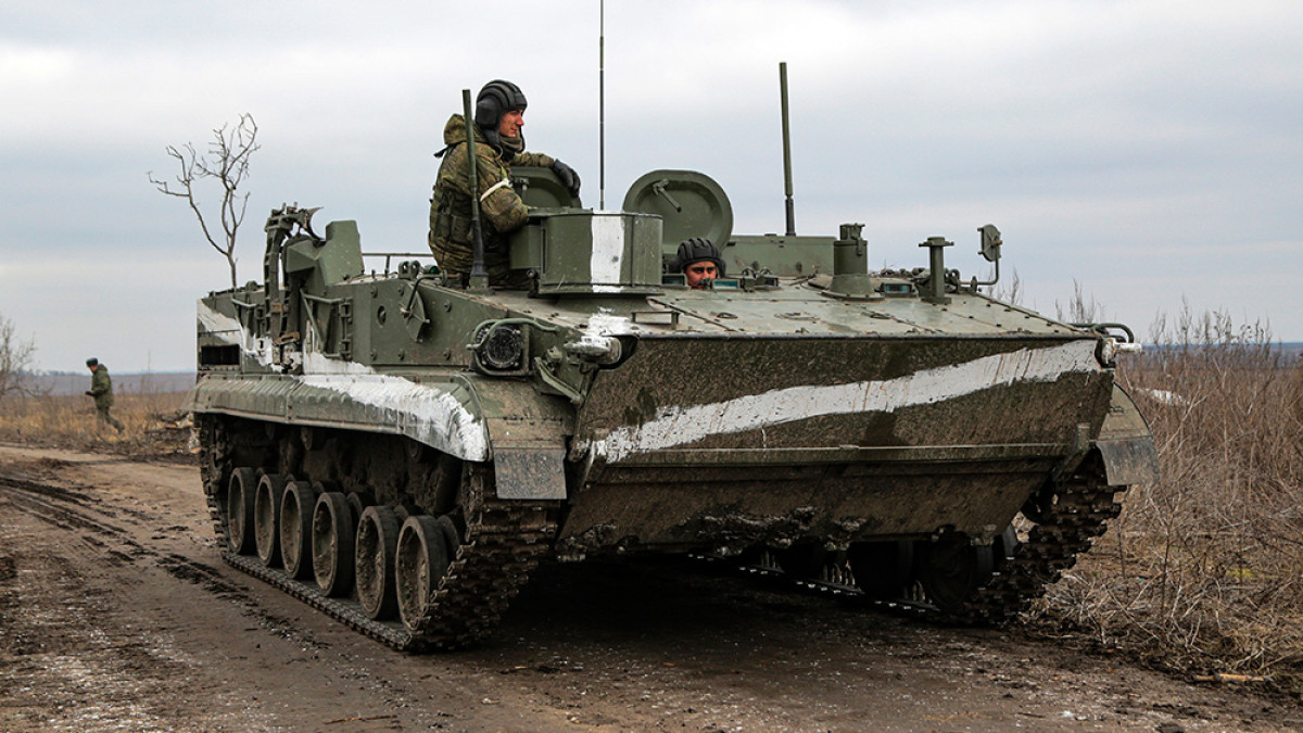 पूर्वी यूक्रेन में समर्थक रूसी आतंकवादियों द्वारा नियंत्रित क्षेत्र में एक बख्तरबंद वाहन से निगरानी रखते सैनिक