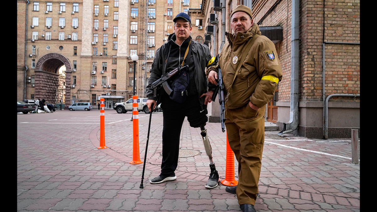 यूक्रेन के कीव में कर्फ्यू के कारण एक खाली सड़क पर गश्त करते हुए तस्वीर के लिए पोज देते सशस्त्र नागरिक रक्षा पुरुष