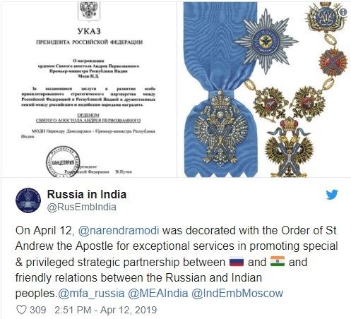 भारत में रूसी दूतावास ने ट्वीट किया, "12 अप्रैल दो नरेन्द्र मोदी को रूस और भारत के बीच विशेष रणनीतिक साझेदारी और दोनों देशों के बीच मित्रतापूर्ण संबंधों को बढ़ावा देने के लिए ऑर्डर ऑफ सेंट एंड्रयू द एपोस्टल से सम्मानित करने का निर्णय लिया गया है।"
